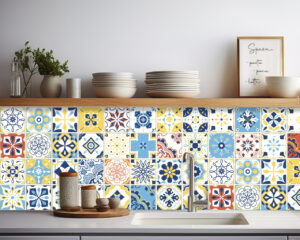 Adesivi per piastrelle “Tangeri”. Decora le tue piastrelle con i rivestimenti adesivi per piastrelle, ideali per arredare le pareti della cucina e del bagno. Gli adesivi per piastrelle trasferiranno l’immagine delle finte mattonelle sul muro, donando fantasia e colore.